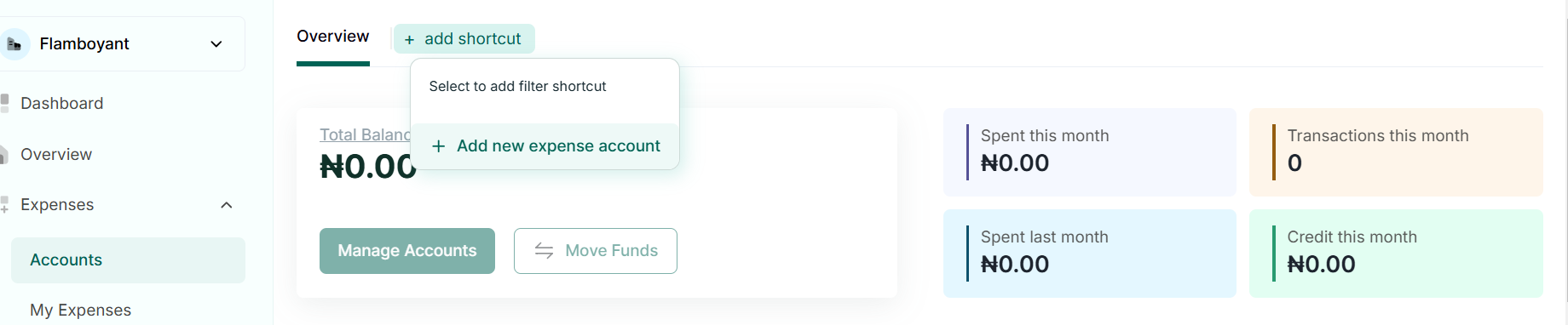 - Click on the plus(+) sign beside the overview and click on Add New Expense Account. As shown below: